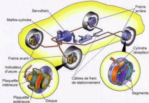 Placés au niveau des roues, les freins sont des organes qui permettent d’arrêter une voiture en utilisant le frottement. Les constructeurs repartissent les forces de résistance différemment entre les deux essieux. Sur les deux roues avant, souvent motrice, il y aura environ 70% de frottement. L’essieu arrière recevra 30% de freinage. Sur les voitures ABS, la répartition est gérée de manière électronique par l’ABS. Cette assistance au freinage évite aussi aux roues de s’arrêter complètement, mais de tourner pour éviter le dérapage.